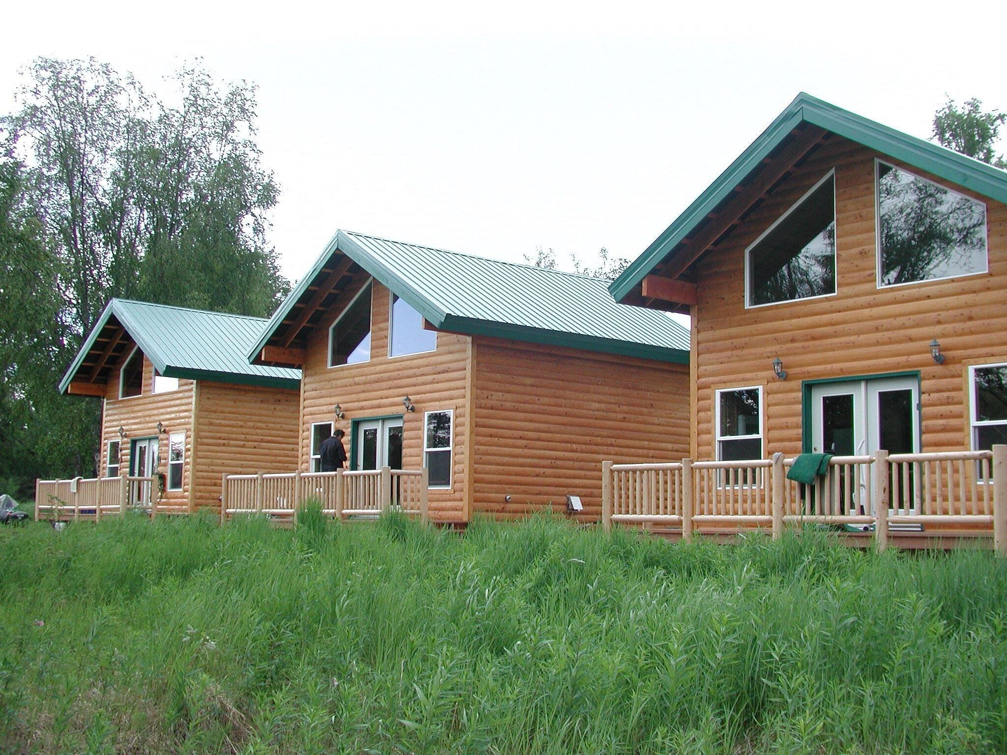 Riverside Cabins – The riverside cabins feature a loft with 3 queen sized beds, and a fabulous view of the glacier fed Kenai. There is also a private bedroom with a queen bed downstairs and a full kitchen with all of the utensils for the discriminating gourmet cook, a nice sized bathroom & a large deck overlooking the river.